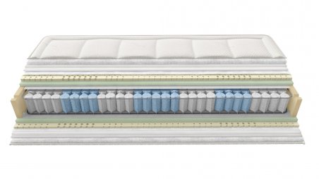 Independent spring unit housed separately in fabric pockets. The 7 different support zones allow the individual elasticity of each spring and provide a high degree of support. This regulates the pressure distribution and ensures ergonomic adjustment to body weight.